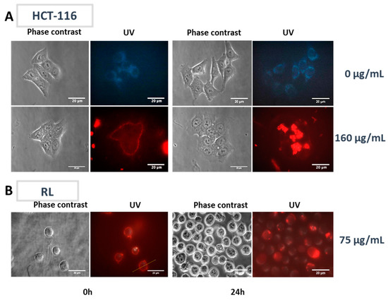Visualization of HCT-116 and RL cells in the presence of LumiLys 650 NPs. HCT-116 and RL cells were incubated with or without LumiLys 650 NPs in the culture medium and visualized by wide field fluorescence microscopy (63× magnification). After 24 h of incubation, cells were first imaged by phase contrast and then by UV excitation using a UV filter (λexc: 340–380 nm, λem: 425 nm long-pass filter). Under UV excitation, cell autofluorescence appeared in blue while SiNPs’ fluorescence appeared in red. (A) HCT-116 were incubated with or without LumiLys 650 NPs (at 160 μg/mL) and (B) RL cells (at 75 µg/mL) in the culture medium.