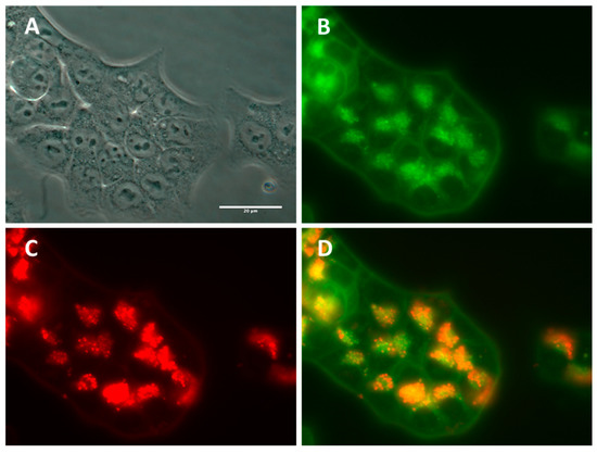 Lysosomal localization of LumiLys 650 NPs in HCT-116 cells. HCT-116 cells were incubated with the LumiLys 650 NPs (100 μg/mL) for 48 h, and lysosomes were labeled with a commercial Lysotracker® lysosome tracking kit. (A) Phase contrast and (B) green fluorescence images of Lysotracker were obtained at 63× magnification. (C) LumiLys 650 NPs appear in red. (D) Merge channels showed co-localization of both signals in yellow. Scale bar corresponds to 20 µm.