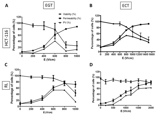 Percentages of viability, permeabilization, and permeable/viable cells as a function of the electric field intensity. (A,C) Electrogenotherapy (EGT) parameters: 10 pulses lasting 5 ms at 1 Hz frequency were applied to (A) HCT-116 and (C) RL cells in suspension. (B,D) Electrochemotherapy (ECT) parameters: 8 pulses lasting 100 µs at 1 Hz frequency were applied to (B) HCT-116 and (D) RL cells in suspension. Viability (round symbol) and permeability curves (square symbol) as a function of electric field (E) amplitude are plotted on each graph. The permeable and viable cells curve (triangle symbol) results from Equation (1). Graphs represent the mean +/− S.D. of three independent experiments.