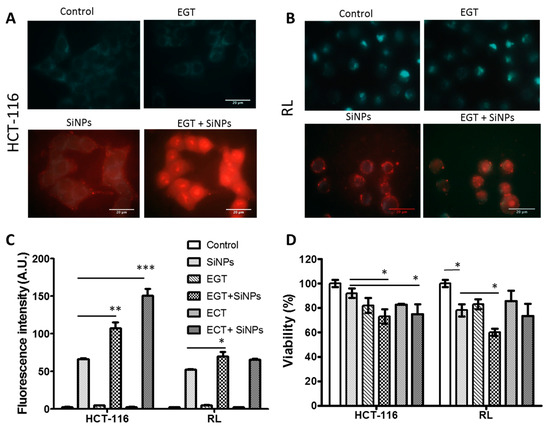 Considering SiNPs incorporation-associated cell viability, we observed that both EGT and ECT treatments alone slightly affected the viability of the HCT-116 and RL cells (80% viability). In the presence of SiNPs, the two cell lines displayed different behavior. Indeed, while EGT and ECT parameters induced a small decrease in the viability of HCT-116 cells, RL cells were less affected by ECT than EGT parameters.