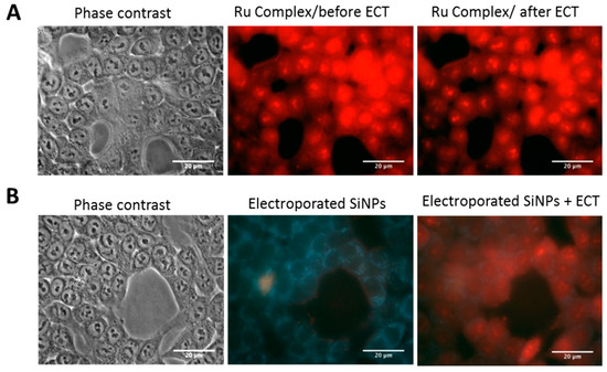 In order to address the question of whether LumiLys 650 NPs were sensitive to EP itself, we designed an additional set of experiments. Indeed, SiNPs subjected to an electric field could disintegrate and thus release the ruthenium (Ru) complex. When the Ru complex alone was incubated with cells, we observed that the Ru complex was by itself capable of entering the cell in a few seconds, even before the application of the PEFs with ECT parameters (Figure 7A). In order to test the Ru complex release hypothesis, a LumiLys 650 NPs suspension alone was subjected to an electric field of 800 V/cm as it was applied to cells. The SiNPs suspension was then deposited on HCT-116 cells and immediately observed by fluorescence microscopy (Figure 7B). Over 10 min, no signal was observed inside the cell, and LumiLys 650 NPs were only adsorbed to the outer membrane of the cell, proving that SiNPs were not affected by the electric field and did not release any Ru complex (Figure 7B). When the same cells were then electropermeabilized, LumiLys 650 NPs entered quickly into HCT-116 cells (Figure 7B). The same experiments were performed with RL cells (data not shown). These experiments clearly indicated that LumiLys 650 NPs remained intact after being exposed to electric field pulses.