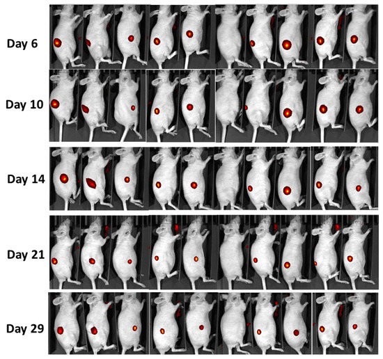 The monitored tumor growth showed that 90% of nude mice (N = 10) developed a tumor. The tumor growth follow-up using fluorescence emission of labelled cells was possible in the NIR range for at least 1 month (Figure 8). Clearly, cell labeling with SiNPs did not impair tumor growth behavior.