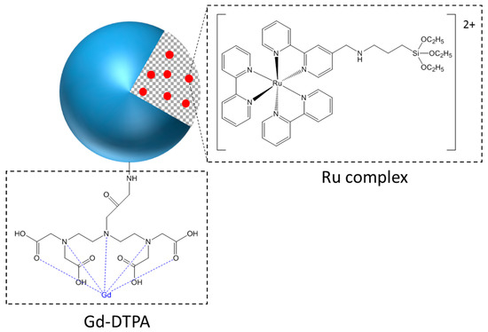 Acetonitrile, 3-aminopropyltriethoxysilane (APTES), diethylenetriaminepentaacetic acid (DTPA), gadolinium chloride hexahydrate, and dimethylsulfoxide (DMSO) were purchased from Sigma Aldrich (St Quentin Fallavier, France). Acetic acid was obtained from Fluka. Ethanol was obtained from Panreac. All SiNPs were provided by Chromalys (Toulouse, France). They consisted of 25 nm diameter SiNPs, incorporating different fluorophores. LumiLys 780 NPs incorporated the cyanine 7 fluorophore, which confers a near-infrared fluorescence to the SiNPs, with an emission centered on 780 nm under 750 nm excitation. This wavelength range is well-adapted for in vivo experiments. LumiLys 650 NPs incorporated a silylated ruthenium tris-bipyridine complex (Figure 1), which confers a red fluorescence to the nanoparticles, centered at 648 nm under 365–500 nm excitation (two maxima at 365 and 488 nm). For a better dispersion in water, LumiLys NPs used for experiments were functionalized with Gd-DTPA (Gadolinium- DiethyleneTriaminePentaacetic Acid) (Figure 9). Moreover, this paramagnetic functionalization allows the use of these particles in magnetic resonance imaging (MRI), which could be very useful in the future.