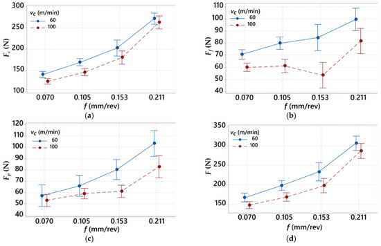 Diagram representing relation between the feed rate f and: (a) main force Fc; (b) feed force Ff; (c) thrust force Fp; and (d) total cutting force F.