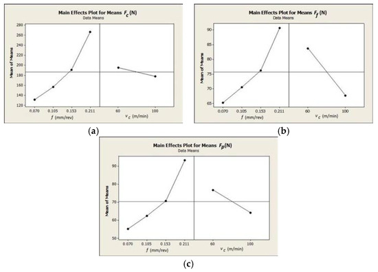 Diagram representing relation between the cutting data (f, vc) and: (a) main force Fc; (b) feed force Ff; and (c) thrust force Fp.