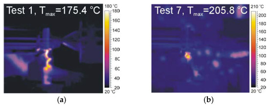 Thermograms recorded by ThermaCamResearcher software for: (a) Trial 1, fmin = 0.07 mm/rev; and (b) Trial 7, fmax = 0.211 mm/rev.