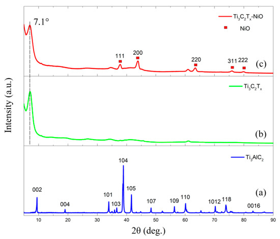 XRD patterns of (a) Ti3AlC2 produced by hot pressing, (b) pure Ti3C2Tx etched by LiF + HCl solution, and (c) 3D porous Ti3C2Tx-NiO composite.
