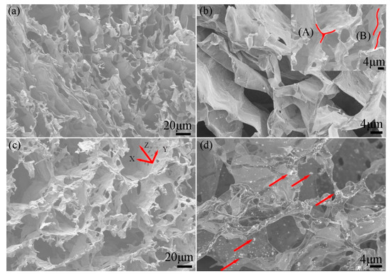 SEM images of the (a) 3D porous Ti3C2Tx, (b) skeleton construction, (c) pores in the wall, and (d) 3D porous Ti3C2Tx-NiO composite with weight ratios of 2:1.