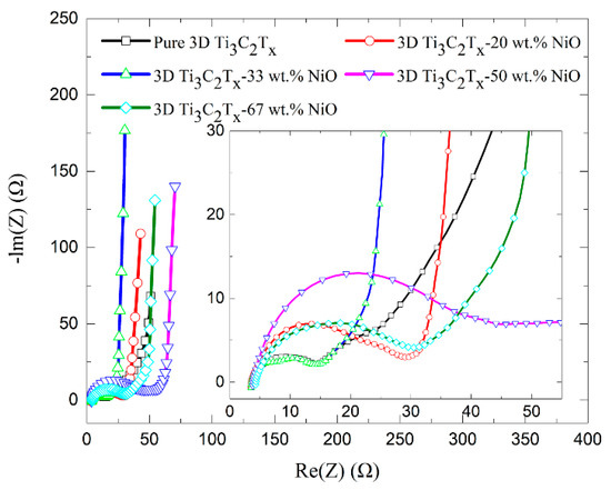 To investigate the ion transport behavior and resistance of the electrode of the samples, electrochemical impedance spectroscopy (EIS) was conducted and the results were shown in Figure 4. Electrochemical impedance spectroscopy could be divided into two regions called knee frequencies, the high frequency region being a semicircular arc and the low frequency region being a straight line. The diameter of the semicircle in the high-frequency range determines the value of the charge transfer resistance (Rct), which was derived from the ion transfer across the interface of the Ti3C2Tx wafer in contact with the electrolyte solution. Capacitive impedance appeared in the wide frequency range and the fast increase of the imaginary part of the low frequency impedance illustrates a capacitance storage mechanism. The low frequencies regions (the straight lines) reflected the Warburg resistance. These results were consistent with the previous reports on Ti3C2Tx membrane material or conducting Ti3C2Tx “clay” electrolytes [37,39]. Although the forms and structures of the electrodes are different, comparable capacitive impedance over a wide frequency range shows the intrinsic properties of the same active material in Ti3C2Tx and this property is not altered with the addition of nickel oxide.