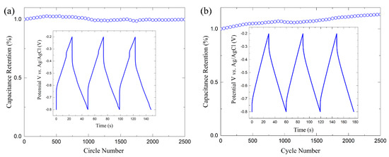 In order to explore the cyclability of the prepared electrodes, pure 3D porous Ti3C2Tx and 3D porous Ti3C2Tx-NiO were also evaluated and results are presented in Figure 5a,b, respectively. Cycling performance was tested by galvanostatic charge-discharge testing at a current density of 1 A/g. The nontriangular shapes of the voltage vs. time profiles shown in the insets are consistent with the pseudocapacitive nature of the charge storage mechanism suggested by the corresponding CVs. The coulombic efficiency of the pure 3D porous Ti3C2Tx and 3D porous Ti3C2Tx-NiO were 99% and 103%, respectively. A slight increase of ~3% of the initial capacitance could be observed for the pure 3D porous Ti3C2Tx electrode after ~1000 cycles, which may be ascribed to the intercalation of Na+ into the interlayer space of Ti3C2Tx, leading to an enhanced capacitance [25]. The capacitance retention was as high as 100% over 2500 cycles, as presented in Figure 5. No capacitance loss was observed for 3D porous Ti3C2Tx-50 wt. % NiO electrode after 2500 cycles (Figure 5b). An increase of ~14% of the initial capacitance could be observed for the pure Ti3C2Tx-50 wt. % NiO electrode after 2500 cycles. The cyclic stability of metal oxides is relatively poor due to chemical reactions [40,41,42], but 3D porous Ti3C2Tx framework itself has good cyclic stability and improve the ion accessibility during the cycling process, which leads to an increased accommodation behavior for charges [36]. The specific capacitance and cyclic stability obtained for 3D porous Ti3C2Tx and its composite in this work were compared to the values reported in the literature and summarized in Table 2.