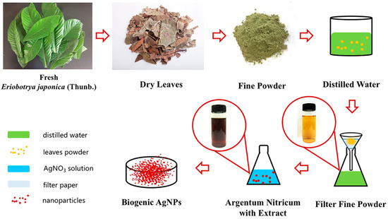 Schematic depiction of the preparation of AgNPs using Eriobotrya japonica (Thunb.).