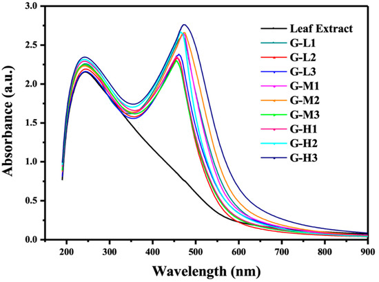 The biogenic nanoparticles were primarily characterized by the rapid color change of Eriobotyra japonica (Thunb.) leaf extract solution from light yellow to dark brown within 5 min after silver nitrate was added (Figure 1). The UV-vis spectra showed strong evidence of colloidal metal particle formation, and the productivity growth in the synthesis medium was indicated by the gradual increase in the absorbance values [26,27]. The silver nanoparticles have free electrons that stimulate the surface plasmon resonance absorption (SPR) band. Figure 2 shows the UV-vis spectra of AgNPs recorded under varying reaction conditions in the wavelength range from 200 to 900 nm and the maximum absorbance of silver nanoparticles occurred at 469 nm. The appearance of the peaks, assigned to surface plasmons, are well-documented for various metal nanoparticles with sizes ranging from 2 to 100 nm [17]. In general, AgNPs showed the absorption spectrum under SPR in the range of 450–490 nm. The sharp peaks indicate the same shape of nanoparticles, while the wide shapes mean that non-uniform particles shapes were created such as triangular and hexagonal shapes. The blue shift was detected in G-H2 due to the SPR oscillation of biogenic AgNPs [28].