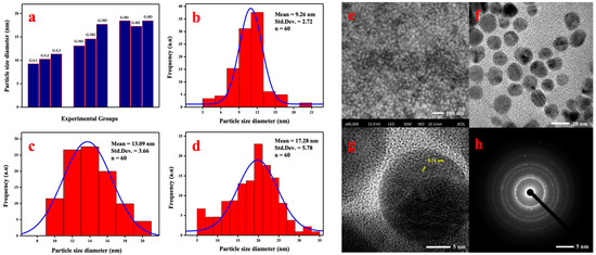 Figure 3 shows the average particle sizes in different treatments based on the TEM results. By analyzing using SPSS 19.0 (IBM, New York, NY, USA), the relative magnitude of reaction conditions on synthesized effect was found (Table 2). The reaction temperature had a remarkable effect on the bio-synthesis of AgNPs compared with the ratio rate and pH. The relationship between particle size and temperature is shown in Figure 3a. The average diameter of synthesized AgNPs increased with the higher reaction temperature. The growth of bigger AgNPs was probably due to the faster nucleation of seed particles under higher temperature condition, subsequently. As shown in Figure 3b–d, the smaller mean diameter of biogenic AgNPs under different temperature conditions synthesized using G-L1 (20 °C), G-M1 (50 °C), and G-H2 (80 °C) were 9.26 ± 2.72, 13.09 ± 3.66, and 17.28 ± 5.78 nm, respectively.