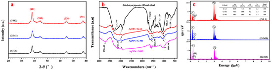 X-ray diffraction pattern (a), the FTIR spectra (b) of dried leaf powder and biogenic AgNPs and EDS analysis (c) of synthesized silver nanoparticles by G-L1, G-M1 and G-H2.
