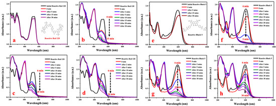 Reductive degradation of Reactive Red 120 using different catalysts: (a) No AgNPs, (b) G-L1, (c) G-M1, and (d) G-H2, and reductive degradation of Reactive Black 5 using (e) No AgNPs, (f) G-L1, (g) G-M1, and (h) G-H2.