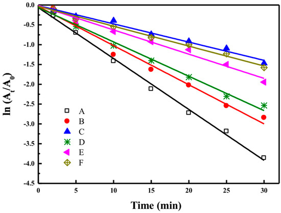 The ln(At/A0) versus time linear fits during the degradation of Reactive Black 5: (A) G-L1, (B) G-M1, and (C) G-H2, and Reactive Red 120: (D) G-L1, (E) G-M1, and (F) G-H2.