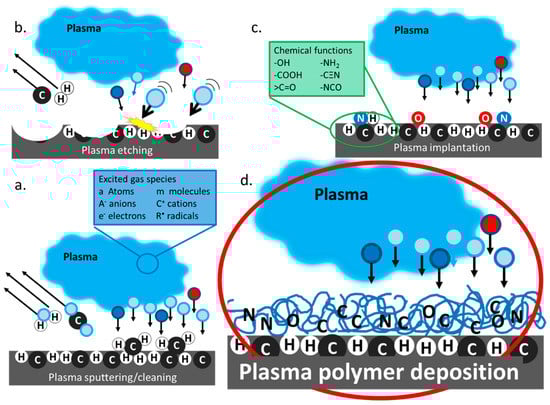Plasma in its natural state can be seen as the polar lights and lightning. Far from being rare, this high energy ionised gas phase, referred to as the fourth state of matter, represents more than 99% of the visible universe. Humans artificially induce plasmas using a variety of energy sources including strong magnetic fields, lasers, radiofrequency, electric fields and microwaves. Man-made plasmas are nowadays seen everywhere from commodities such as TV screens, toys and low energy lighting to nuclear reactors and aircraft propulsion turbines. What may be less obvious for some are all industrial uses of plasmas, not as a finished product, but as a manufacturing tool for material surface modification [1]. Plasmas are constituted of highly energetic molecules, molecular fragments, ions, radicals and free electrons. As a result, when plasmas come in contact with solid surfaces, may it be metal, plastic or any other material, they cause important changes to the material surface properties. In this way, it is possible to use plasma-assisted processes to modify a material surface energy, wettability, chemistry and even topography to suits a variety of applications with the added advantage that the properties of the bulk materials are preserved. Plasma-assisted surface modifications encompass a range of techniques which Chu et al. described in quite some detail for the specific case of biomaterials surface modification [2]. Yet, plasma-induced surface treatments processes are used to create novel materials with unique electronic, optical, mechanical and biological properties for many different fields of applications. When the excited species present in the plasma generated from inert (Ar, Ne, He …) or reactive (O2, N2, NH3, CO2 …) gases collide with the solid, enough energy may be acquired by the atoms on the surface layer of the solid for them to detach from the surface. When the physical degradation of the bulk material is limited to the outermost layer, the plasma process is called sputtering, Figure 1a [3]. This is the process used in plasma cleaners to remove impurities from contaminated surfaces. If further deeper loss of the exposed material occurs, however, the process is referred to as plasma etching, Figure 1b. Plasma etching is a process in which the adsorption of energetic species is followed by product formation, prior to product desorption [4]. Combination processes have also been reported where anisotropic chemical etching is accelerated by ion sputtering [5]. In biomaterials engineering, plasma is generally used for surface cleaning and sterilisation but at its extreme, plasma etching can also be used for surface roughening and nanopatterning, and even generating novel nanostructures [6,7,8,9]. It is also possible for excited species present in the plasma phase to directly react with the substrate and induce surface modification including the grafting of new chemical functions, such as amine or hydroxyl groups [10]. This process is often referred to as plasma ion implantation. The downside of modifying a surface via plasma sputtering or implantation is that the modification is short lived because reorientation of the surface functional group occurs overtime [11,12,13,14]. Surfaces with lasting properties that completely differ from those of the bulk materials can be generated via plasma polymer deposition. It differs from the other plasma-assisted surface modification in the fact that a thin organic coating is formed over the surface of the original material (Figure 1d). Figure 1 provides an simplified visual representation of the main class of plasma surface modification processes, in which the effect of plasma-wall interaction and particle distribution in the sheath region have not been represented. Important phenomena occurring in this region are still under fervent investigation [15,16]. The figure also does not represent the influence of reactor geometry on the plasma deposition process. The interested reader can refer to an article by Whittle et al. where an international consortium compares coatings produced in 14 different plasma reactors [17].