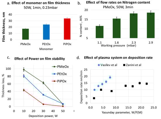 PPOx deposition conditions: (a) Effect of monomer chemistry on film thickness, (b) precursor flow rates on nitrogen content, (c) of plasma ignition powers on films stability for MeOx, EtOx and PiPOx. (d) PPEtOX Plasma deposition rate as a function of the Yasunda parameter is defined as the ratio between plasma power and monomer flow rate, in two different plasma reactors.