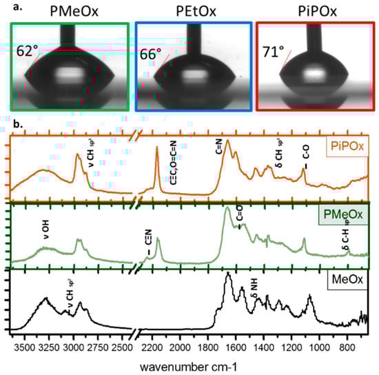 (a) Advancing water contact angle of water in air on plasma-deposited Methyl, Ethyl, and isopropenyl oxazoline deposited at 50 W and 2.3 mbar. (b) FTIR spectra of isopropenyl, and methyl oxazoline deposited under the same conditions as well as a pristine methyl oxazoline precursor.