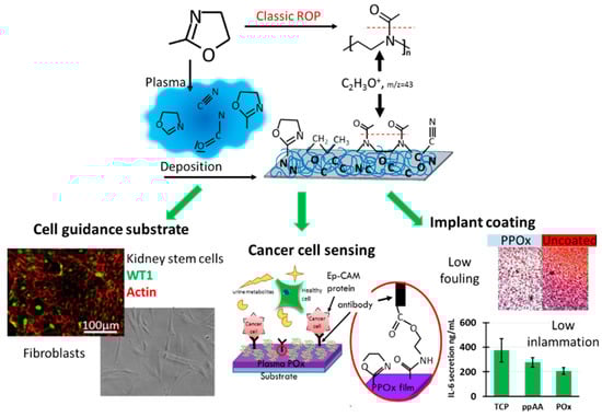 Schematic illustrating the PPox deposition process (top) and its applications (bottom) for cell guidance surfaces, diagnostic devices and low fouling properties. The left images illustrate the biocompatible nature of PPOx coating on which multiple cell types including human dermal fibroblast and kidney stem cells proliferate as successfully as on tissue culture plate. The middle schematic illustrates the reaction occurring between PPOx and biomolecule with COOH function and how this biofunctionalisation is used for the selective capture of cancer cells. The right-hand side shows the inhibited proliferation of biofilm on PPOx substrates as well as the decrease in pro-inflammatory cytokine IL6 secretion, which together makes PPOx a suitable candidate for implant coatings.