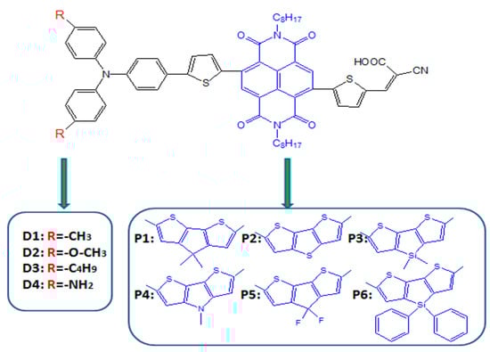 - Panneerselvam, M.; Kathiravan, A.; Solomon, R.V.; Jaccob, M. The role of π-linkers in tuning the optoelectronic properties of triphenylamine derivatives for solar cell applications–A DFT/TDDFT study. Phys. Chem. Chem. Phys. 2017, 19, 6153–6163. [Google Scholar] [CrossRef]
