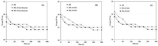 | PE + 3 wt.% Ca stearate | 207 ± 7 | 23.8 ± 1.3 | 661 ± 27 | 102 | −91 |