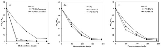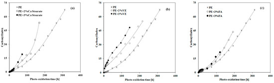 - Pablos, J.L.; Abrusci, C.; Marín, I.; López-Marín, J.; Catalina, F.; Espí, E.; Corrales, T. Photodegradation of polyethylenes: Comparative effect of Fe and Ca-stearates as pro-oxidant additives. Polym. Degrad. Stab. 2010, 95, 2057–2064. [Google Scholar] [CrossRef]