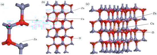 The models of: (a) pure ZnO, (b) Cu0.0417Zn0.9583O supercell, (c) Cu0.0278Zn0.9722O supercell.