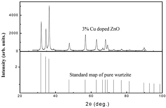 In this paper, Cu-doped ZnO was prepared by a two-step method. The doping molar ratio of Cu was 3%, the calcination temperature was 500 °C, and the calcination time was 3 h. Figure 2 shows the XRD pattern of copper-doped zinc oxide. Compared with the ZnO standard map of pure wurtzite, the structure of zinc oxide after Cu doping is a wurtzite structure, and the doping does not change the symmetry of the crystal structure. According to the Scherrer formula, the particle size of Cu-doped ZnO is 22 nm. There is no copper peak formed after doping because the doped copper enters the zinc oxide structure. The unit cell parameters of ZnO after doping are a = b = 0.32498 nm, c = 0.52066 nm, which is consistent with the calculation results.