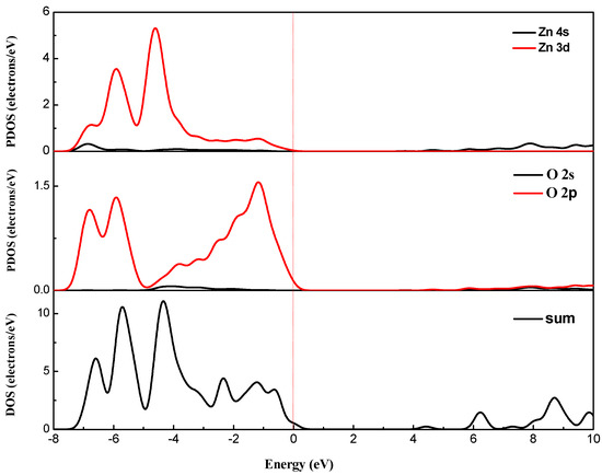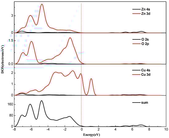 The number of valence electrons of copper is lower by one compared with zinc atoms. Therefore, copper doping is a p-type doping, which introduces holes in the valence band. It can also be seen from Figure 6 and Figure 7 that the Fermi level enters the valence band. The conduction band of pure zinc oxide is mainly composed of the 4s state of zinc and the 2s state of oxygen. The bottom of the conduction band is determined by the 4s state of zinc. The valence band is mainly composed of the 3d state of zinc and the 2p hybrid state of oxygen. At the top of the valence band, the 2p orbital interaction of oxygen produces anti-bonds between the s-like anti-bond and the p-like group, thereby forming a band gap. The calculation results show that with the increase of copper doping amount, the band gap of the copper single-doped system is narrowed, and the calculation results tend to be consistent with the experimental results [28].