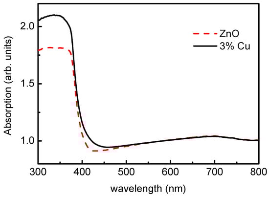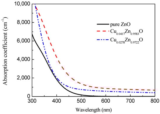 At the same time, we prepared wurtzite-type zinc oxide and copper-doped zinc oxide by a two-step method. It can be seen from Figure 10 that the spectrum after copper doping has a large absorption in the visible light region, and the light absorption coefficient of visible light is obviously improved. It can be seen that the calculation and experimental results tend to be consistent. This indicates that copper doping increases the light absorption of the zinc oxide photoanode in the visible range, thereby increasing the photoluminescence yield and photocatalytic efficiency of zinc oxide, extending the spectral response range of zinc oxide, and improving the utilization of solar energy.