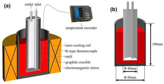 (a) Schematic view of the melt treatment apparatus by IC-AEMS, (b) the experimental dimensions of the graphite crucible and the inter-cooling rod.