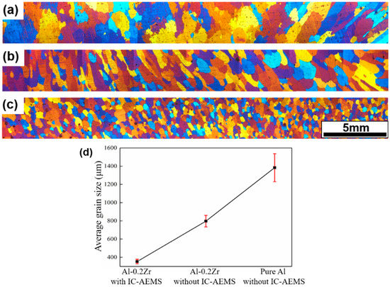 To assess the effectiveness of IC-AEMS above the liquidus on grain refinement, pure Al, as well as Al-0.2%Zr with and without IC-AEMS, was poured and solidified in a TP-1 mold at a cooling rate of 3.5 °C/s when the melt temperature dropped to that of the liquidus (720 °C). The as-cast microstructures of pure Al and Al-0.2%Zr alloy samples with and without IC-AEMS above the liquidus are presented in Figure 3. Pure Al has a typical dendrite grain in Figure 3a, but it turns to a columnar grain without IC-AEMS after Al-10%Zr master alloy addition in Figure 3b. The average grain size is reduced from 1383 μm to 797 μm, which indicates that the addition of grain refiner alone above the liquidus can lead to a small refinement efficiency in the Al alloy, to the point of having equiaxed grains—even with high levels of Zr solute. When IC-AEMS is applied, an almost fully refined equiaxed grain structure is obtained in Figure 3c, and the average grain size is reduced from 797 μm to 354 μm. The range of error bars Figure 3d indicates the variation in grain sizes.