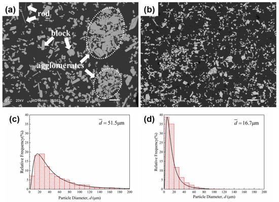 Figure 4 presents the micrograph of primary Al3Zr particles deposited at the bottom under a slow cooling rate (0.4 °C/s) after being treated with and without IC-AEMS. Two typical primary Al3Zr crystals are seen in Figure 4a: several blocky phases and a few rod-like phases in the alloy. There were even a series of Al3Zr agglomerates performed without IC-AEMS. In comparison, Figure 4b shows a high density of small, homogeneous particles distributed in the aluminum matrix. The size distribution of the primary Al3Zr particles can be well-fitted by a log-normal function, as indicated by the solid line in Figure 4c,d. The maximum diameter observed in the alloy is around 200 μm, while the minimum diameter is just 2 μm in Figure 4c; the mean particle diameter is 51.5 μm without IC-AEMS. After being treated with IC-AEMS, the Al3Zr particles are uniformly distributed in the Al matrix, and the mean diameter is greatly decreased to 16.7 μm. Most particles are 2–40 μm (Figure 4d). This shows that the application of IC-AEMS to Al-0.2%Zr alloy above the liquidus refines the primary Al3Zr particles.