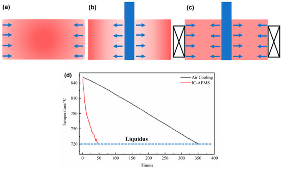 Schematic view of the heat dissipation of the melt in the crucible under different conditions: (a) cooling in the air; (b) inter-cooling insert; (c) inter-cooling with electromagnetic stirring; and (d) cooling curves of Al-0.2%Zr alloy with and without IC-AEMS.