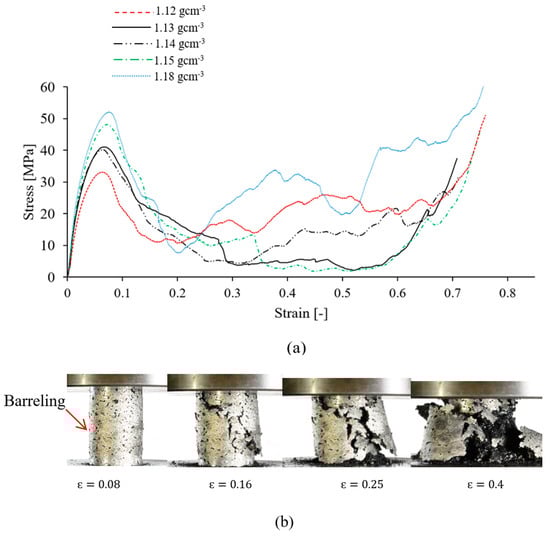 | Sample Density (gcm−3) | Quasi-Elastic Gradient (MPa) | Peak Stress (MPa) | Plateau Stress (MPa) | Energy Absorption (MJ/m3) |