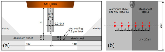 In this study, sheets of aluminum alloy EN AW-6014 T4 were joined with sheets of galvanized mild steel DC04 by means of the single-sided cold metal transfer [47,48] process. The metal sheets were clamped gap-free in horizontal butt-joint position, as schematically illustrated in Figure 1. The dimensions were 250 mm × 150 mm × 0.80 mm for the steel sheet, and 250 mm × 150 mm × 1.15 mm for the aluminum alloy sheet.