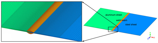 As shown in Figure 2, the model included three parts: the aluminum sheet, the steel sheet, and the weld seam, with dimensions according to the experimental welding configuration. The complete model consisted of approximately 504,000 nodes and 425,000 elements. The interface between the weld seam and the steel sheet was meshed with comparatively fine elements, since the temperature at this interface was of primary interest for calculating the thickness of the IM layer. Figure 2 also shows that the mesh was coarser with increasing distance to the weld seam, in order to limit the required calculation time. A cross-section of the meshed model is shown in Figure 3.