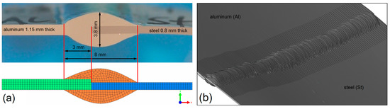 According to the results of the welding experiments, the maximum thickness of the weld seam was about 3.8 mm, and the width between the base corners of the weld seam was about 8 mm. These dimensions were estimated from micrographs of the weld cross-section, as exemplarily shown in Figure 3a. The micrographs were captured using a Zeiss Axio Observer.Z1m (Jena, Germany) optical microscope equipped with a Zeiss Axio-Cam MRc5 camera. The dimensions of the weld seam were validated with a three-dimensional reconstruction of the joint surface as shown in Figure 3b, which was captured using the optical 3D scanning system GOM ATOS III Triple Scan (Braunschweig, Germany). Neither small variations of the actual weld seam geometry nor thermal distortion of the sheets were considered in the model, since their effects on the growth and on the thickness of the IM layer are negligible.