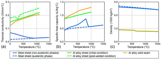 As shown in Figure 4, temperature-dependent thermal conductivity, specific heat capacity, and density were considered for both sheets and for the weld seam. These thermo-physical properties were obtained by adapting predefined material data of the available Visual-Weld database (R 13.5, ESI Group, Paris, France).