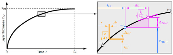 For discrete steps, and if parabolic growth ( = 0.5) of the IM layer is assumed, Equation (7) can be transformed into Equation (8). For each of these steps, = 1, 2, 3..., one can calculate the growth increment, , based on the actual time of growth, , the time increment, , and the growth rate coefficient, , as follows: