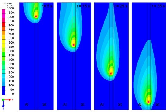 Temperature field at the top surfaces of the aluminum sheet (Al), the steel sheet (St) and the weld seam at 5 s, 15 s, 25 s, and 35 s after starting the welding process.