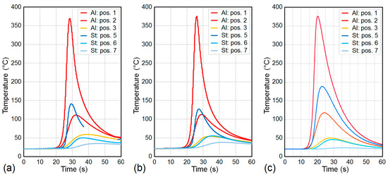 The numerical simulation provided the time-dependent temperature field inside the metal sheets and inside the weld seam during the welding process, as well as during the post-welding cooling period. In particular, the evolution of the temperature field next to the weld butt at the top surfaces of the weld seam and of the two metal sheets is illustrated in Figure 6. Though the cooling conditions were equal for both sheets, the non-symmetric temperature field reveals that the majority of the welding heat flowed into the aluminum sheet. This is confirmed by the temperature curves illustrated in Figure 7, which show that the peak temperatures captured at equal distances from the weld butt were almost twice as high in the aluminum sheet as in the steel sheet. Obviously, comparing the temperature curves at particular positions reveals good qualitative and quantitative agreements between the welding experiments (Figure 7a,b) and the welding simulation, (Figure 7c).