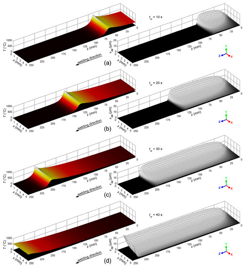Figure 8 shows the calculated temperature, , (left column) and the corresponding thickness of the IM layer, , (right column) at the top section of the bonding interface between the steel sheet and the weld seam at the welding times = 10 s, 20 s, 30 s, and 40 s.