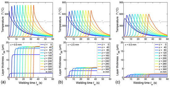 As illustrated in Figure 8, the temperature wave related to the movement of the welding torch propagated in welding direction. The peak of this wave was located close to the actual position of the torch. The growth of the IM layer was initiated when the temperature at the wave front exceeded 400 °C, and it proceeded as long as the temperature stayed above this limit. The thickness of the IM layer in welding direction was constant from ≈ 50 mm to ≈ 230 mm, but it varied distinctly perpendicular to the welding direction. Obviously, the thickness did not decrease when the weld cooled down. However, note that the thickness of the IM layer was overestimated at the end of the weld line, since the thermal weld penetration observed in the experiment (i.e., excessive melting of the sheets due to overheating at the end of the weld line) was not considered in the numerical model. Figure 9 illustrates the time-dependent evolution of both temperature and IM layer thickness at ten different positions (-coordinates) along the welding direction, and at three different distances (-coordinates) from the weld butt at the top section of the bonding interface.