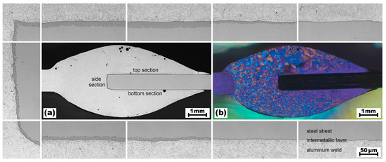 Weld seam cross-section of sample 63, (a) unetched and (b) etched with Barker’s reagent. The surrounding micrographs illustrate the thickness variations of the IM layer.