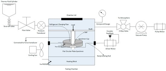 Phoenix Tribology reciprocating tribo-meter, TE 57 Pressurized Lubricity Tester (Phoenix Tribology, Kingsclere, UK) was modified to test the next generation of refrigerant, HFE-7000. The modified tribo-meter is schematically represented in Figure 1.