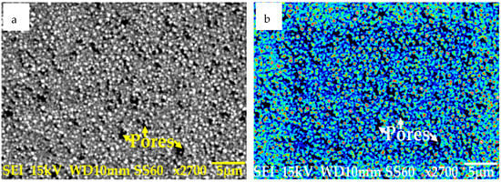 The microstructure of the prepared coating was studied using a Scanning Electron Microscope (JEOL, Tokyo, Japan). High magnification images of the prepared nanocomposite coating are presented in Figure 2. The microstructure of the prepared Ni–Al2O3 nanocomposite coating is similar to the microstructure reported by various other researchers [,,,]. The high magnification image shown in Figure 2a shows that there are pores on the surface of the electrodeposited nanocomposite coating. These pores are a characteristic of Ni–Al2O3 nanocomposite coatings []. Figure 2b shows the nanocomposite coating after the application of false color to the Scanning Electron Microscope (SEM) image. The colored image better reveals the pores on the coating, which are randomly distributed and are visible as dark colored spots in the colored image.