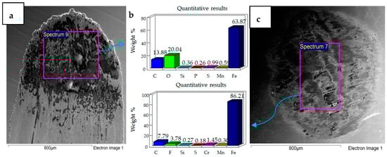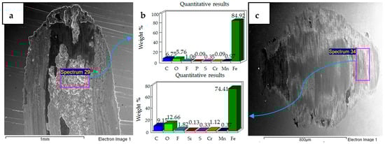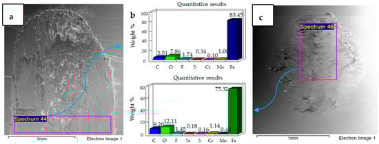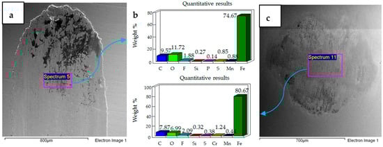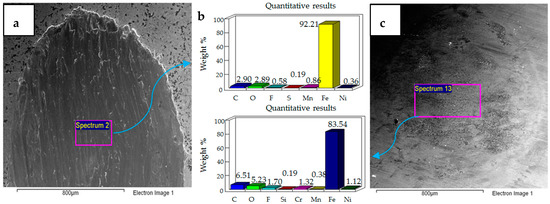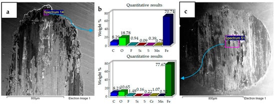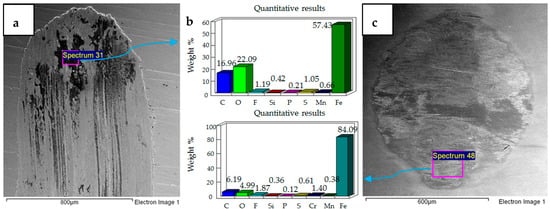SEM micrographs of 20 N, 20 °C are presented in Figure 5. Compared to 10 N/20 °C, 20 N/20 °C operating conditions produced more abrasive wear of both the flat and ball samples. EDS analysis also revealed the transfer of particles from the ball onto the flat circular specimen, along with the presence of oxygen and fluorine on the rubbing surfaces.