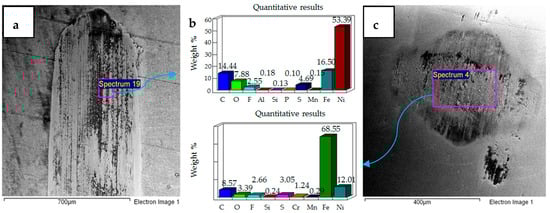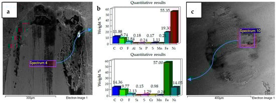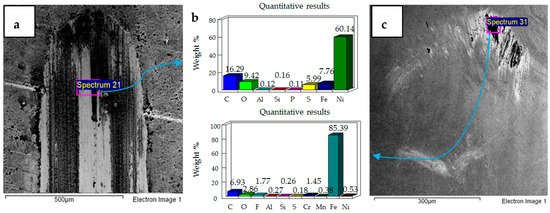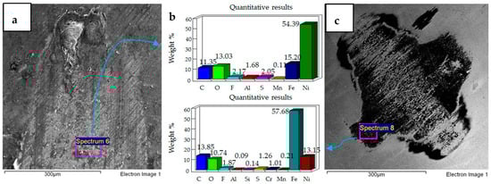 Micrographs and EDS results of flat Ni–Al2O3 nanocoated samples against 52100 steel ball at 10 N, 20 °C are shown in Figure 11. Figure 11a shows the micrograph of wear on the flat specimen. The image shows micro-delamination of the coating and exposure of the steel substrate. Ni–Al2O3 nanocomposite coatings have been reported to delaminate under reciprocating motion []. Micro-delamination of the coating was observed throughout the wear scar. The coating under these operating conditions is, however, still very much intact, and comparing the coated steel sample to the uncoated steel sample at 10 N/20 °C shows a reduction in wear. Micrographs of the steel ball show a combination of adhesive and abrasive wear, along with the adhesion of the delimited particles on the steel ball. Post-test EDS analysis of the steel ball shows a presence of nickel and aluminum, indicating adhesion of the delaminated coating from the flat sample on the steel ball along with fluorine and oxygen. EDS analysis on the flat sample shows iron, indicating the exposure of the steel substrate. Fluorine and oxygen were also detected on the flat sample, implying the formation of tribo-films.